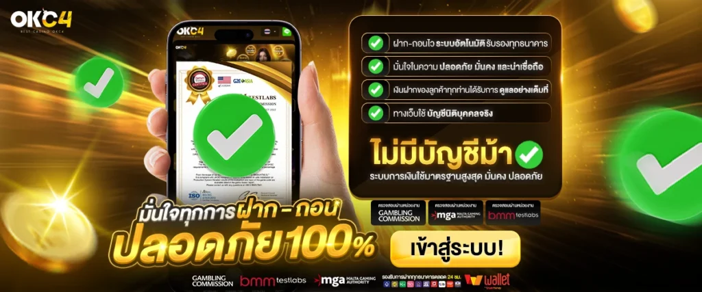 OKC4 ให้ความสำคัญกับความปลอดภัยของผู้เล่น ด้วยระบบเข้ารหัสข้อมูลและการจัดการธุรกรรมที่ได้มาตรฐาน ช่วยให้ผู้ใช้งานมั่นใจได้ในทุกการเล่นและทุกการเงิน